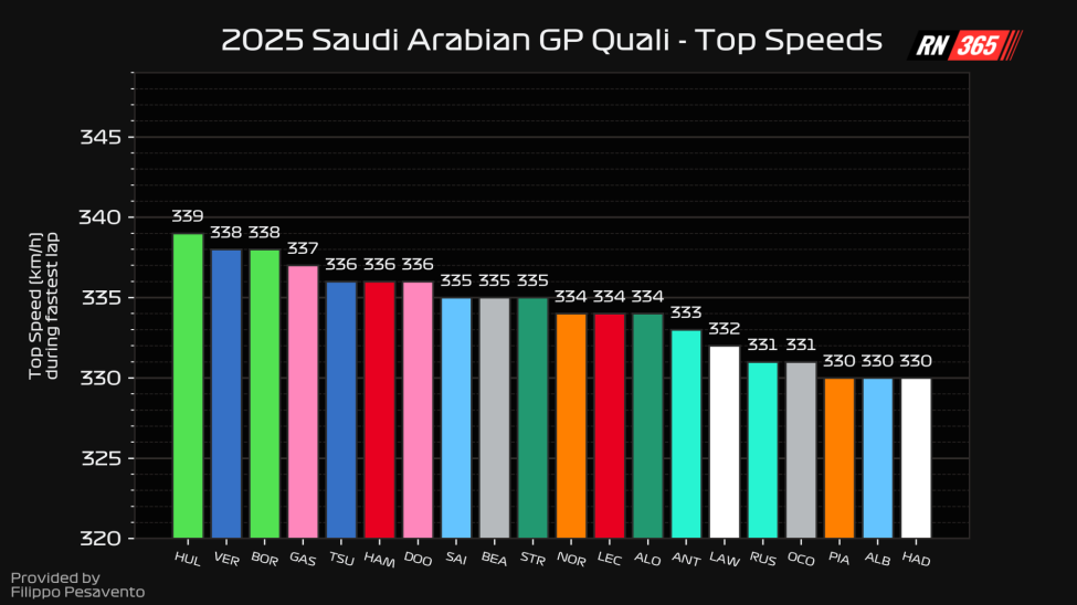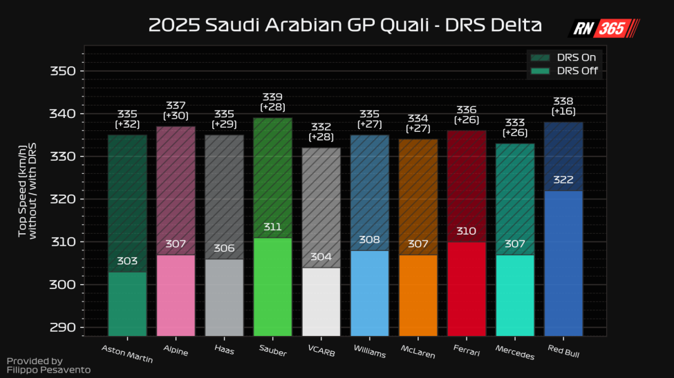 This speed difference significant reduces when both cars run an open rear wing, as Verstappen reached 338 km/h when using DRS, whilst Piastri hit 330 km/h.