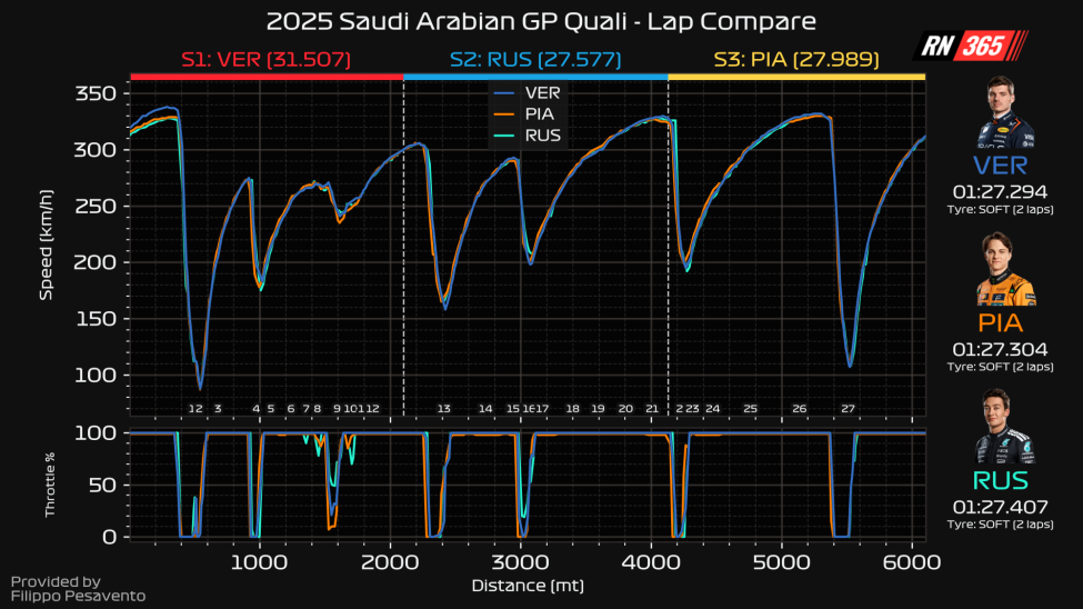 View the data of the laps of Verstappen, Piastri and Russell below. The text continues after that.