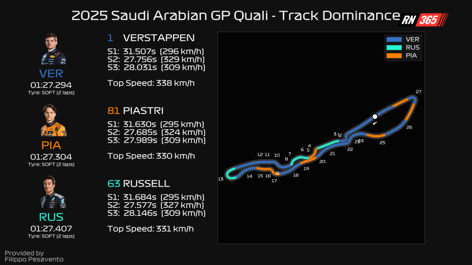 It was a qualifying session of fine margins, with a different driver and car having been fastest in each sector. Verstappen was quickest in sector one, George Russell in sector two and Piastri in the final sector.