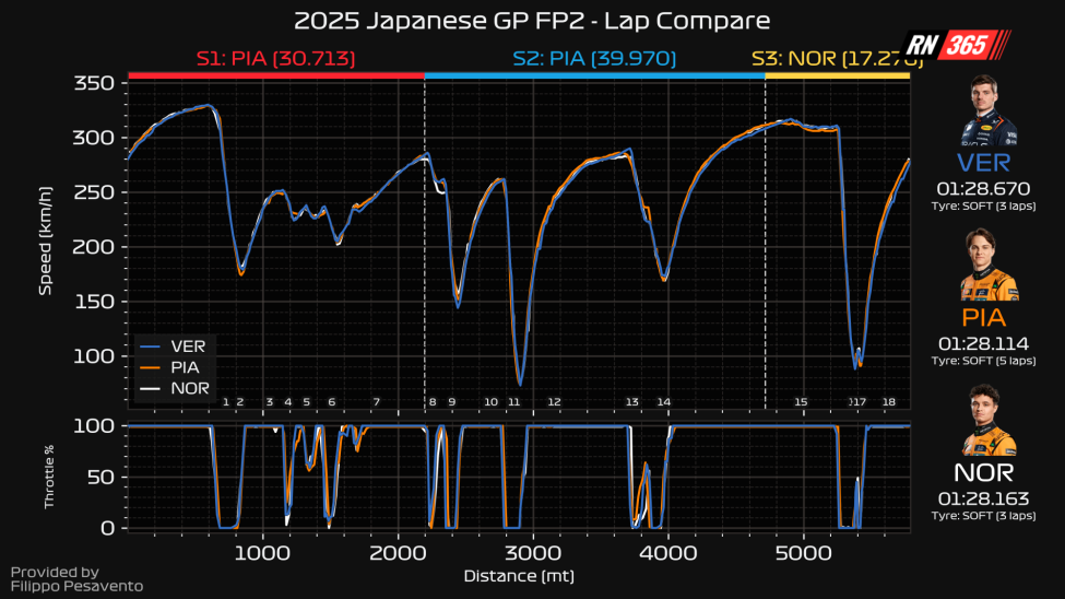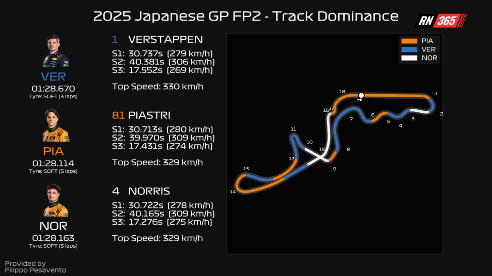 But through the sweeps of Sector 1, Verstappen was nip and tuck with Piastri and Norris as only 0.024s separated the trio with Piastri pulling clear of the other two through the second sector, being particularly strong through the Degners and Spoon.